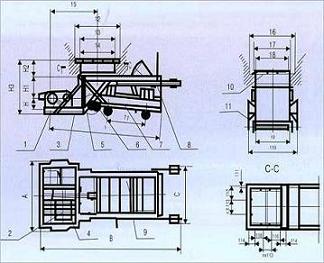 標(biāo)注:1.減速機 2.電動機 3.傳動平臺 4.聯(lián)軸器 5.H形架 6.連桿 7.給煤槽 8.閘門 9.機架 10.漏斗 11.托輥